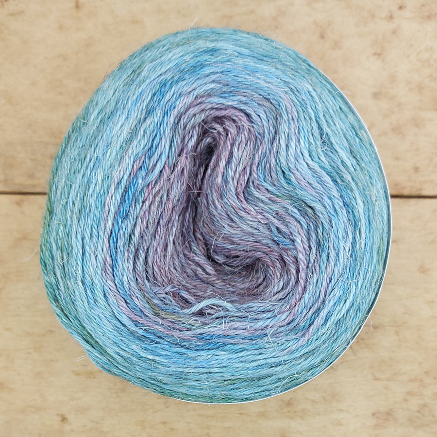 ASL is a drapey mix of alpaca (50%), silk (25%), and linen (25%), in a 100g gradient cake (400 m/ 437 yds).