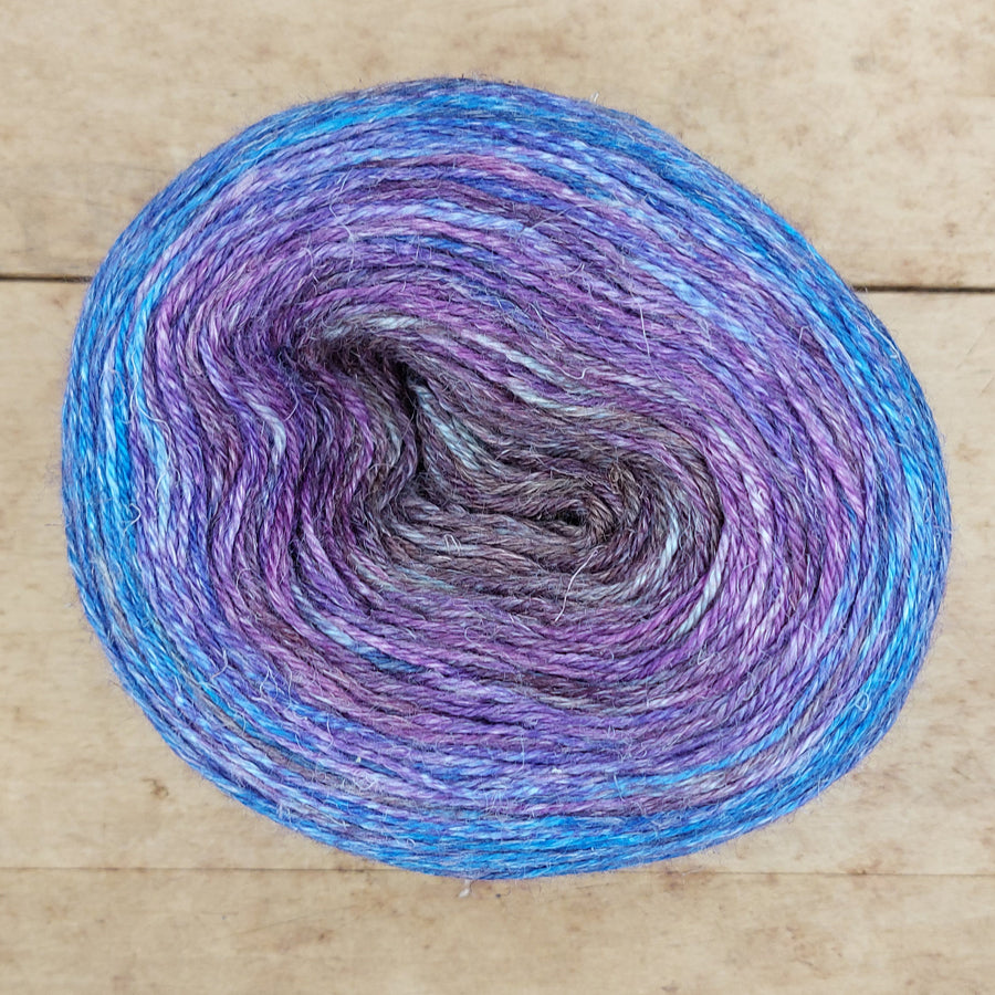 ASL is a drapey mix of alpaca (50%), silk (25%), and linen (25%), in a 100g gradient cake (400 m/ 437 yds).