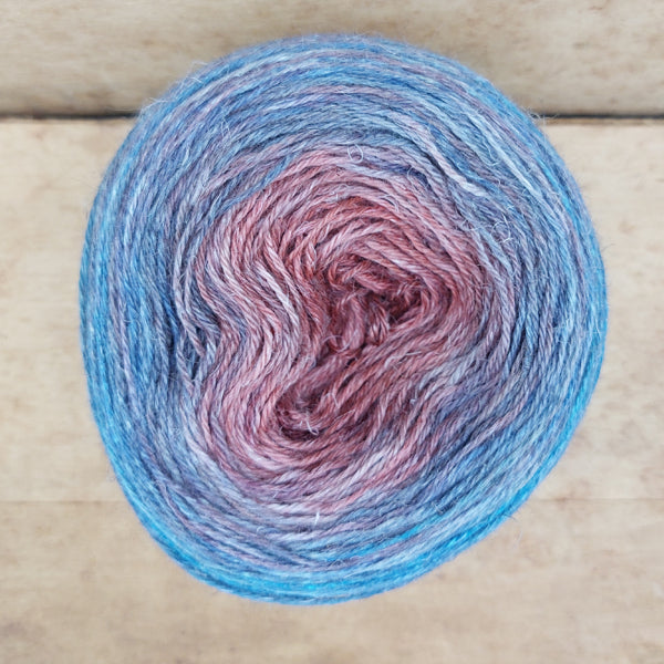 ASL is a drapey mix of alpaca (50%), silk (25%), and linen (25%), in a 100g gradient cake (400 m/ 437 yds).