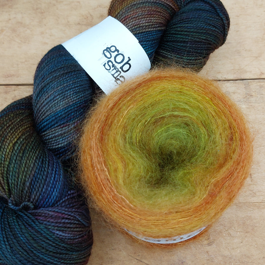 The Fuzz in this kit is a gradient from muted golden orange to soft acid green dappled with deep rust to murky mossy green dappled with warm brown (50g, 72% kid mohair/ 28% silk, 420 m/ 459 yds). It is paired with a skein of merino fingering that is variegated with very dark navy, petrol, eggplant, everygreen, and warm brown (essentially, a rainbow of colours, but in earthtones) (100g of 100% superwash merino, 361 m/ 395 yds)