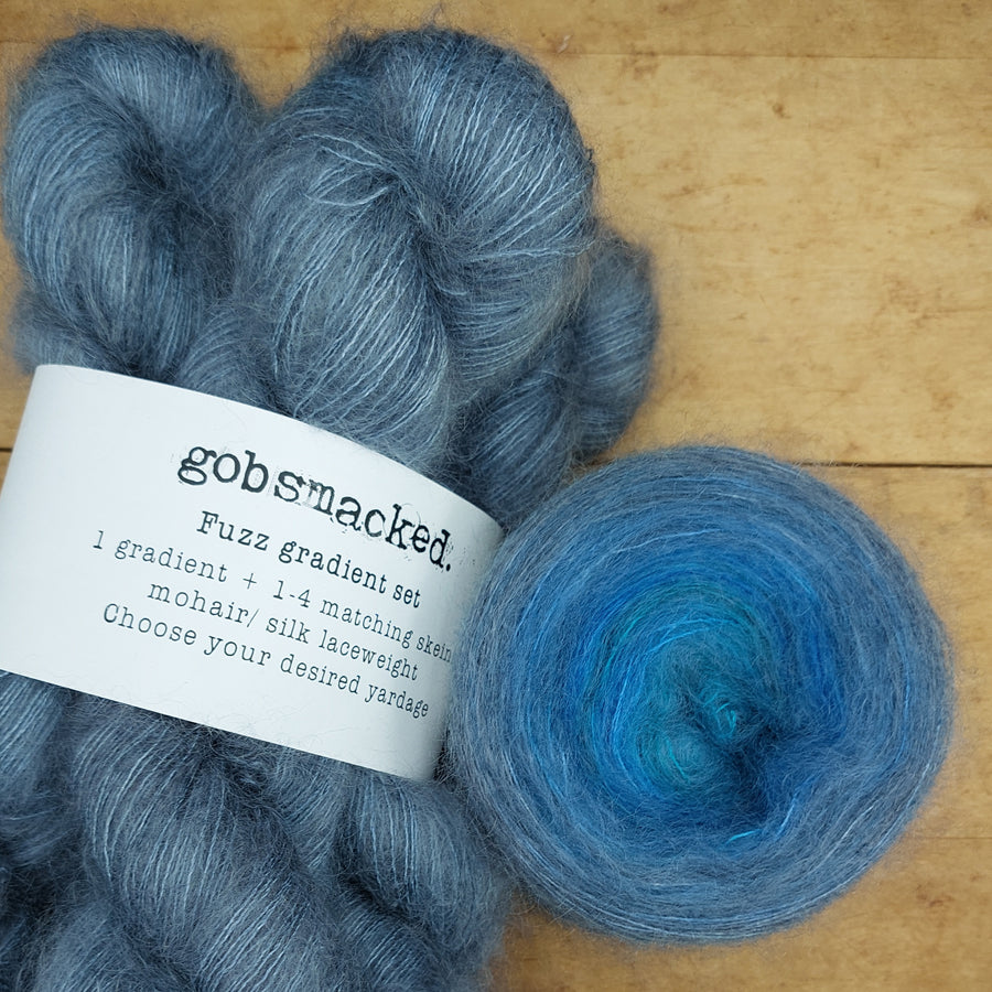 This Sweater Fuzz set combines a 50g mohair/ silk gradient from aqua to sky blue to soft blue-grey, with 1-4 blue-grey skeins dyed to match the outside of the gradient. You may choose how many matching skeins you need for your project-- just keep in mind that every set of Sweater Fuzz is one-of-a-kind, so it will not be possible to buy more matching skeins in the future!